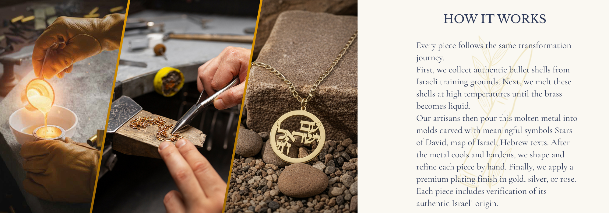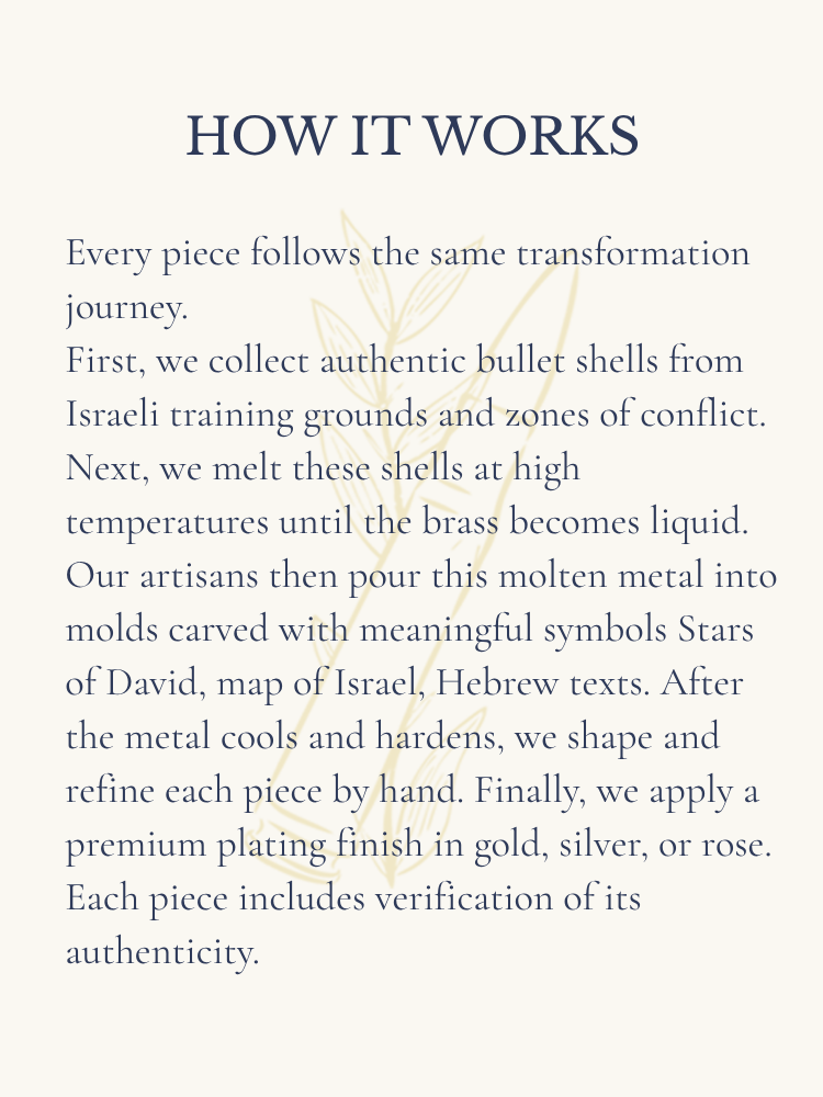 Celebrate your connection to the Holy Land with handcrafted Israel symbol necklaces from Jerusalem's Old City. Each piece features sacred emblems that represent Jewish heritage and spiritual connection to Israel including the Star of David, Hamsa hand, Hebrew letters, and Jerusalem symbols. Choose from three meaningful materials: authentic IDF bullet shell, premium 925 sterling silver, or military grade stainless steel. Each piece includes custom Hebrew engraving and comes with a certificate of authenticity from our Jerusalem workshop.